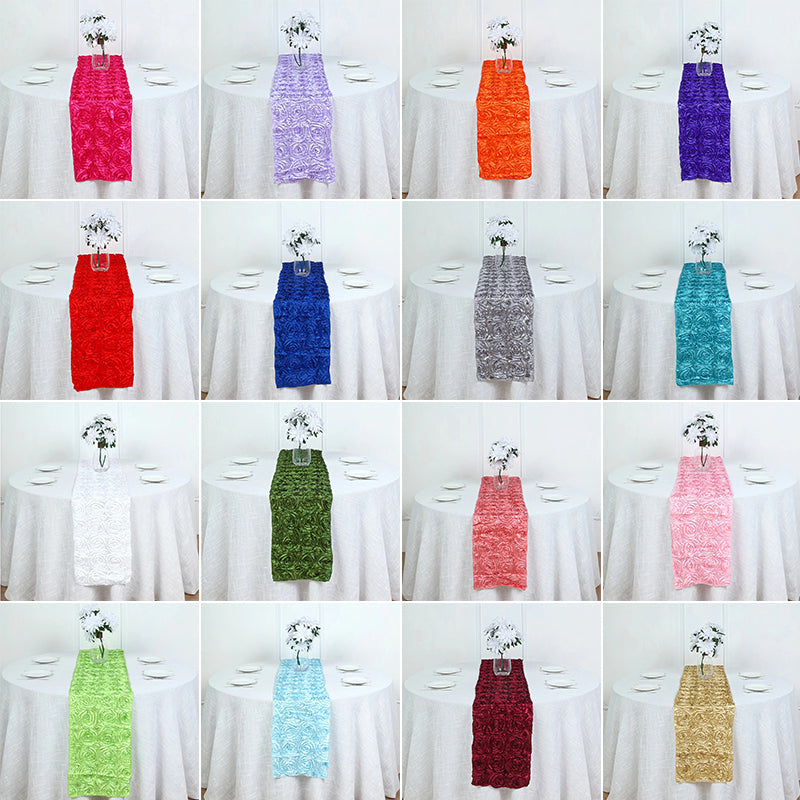 Make a stunning impression with our Wedding Rosette Satin Table Runners! Don't let the name "Wedding Rosette" limit you, our beautiful table runners are perfect for baby showers, Quincenearas, birthday celebrations, and any other special occasion. Each table runner is constructed of a satin background covered in fantastic rosettes with smaller rosettes nestled in the spaces between them. Our Wedding Rosette Satin Table Runners will be the memorable decorative detail of your special day!