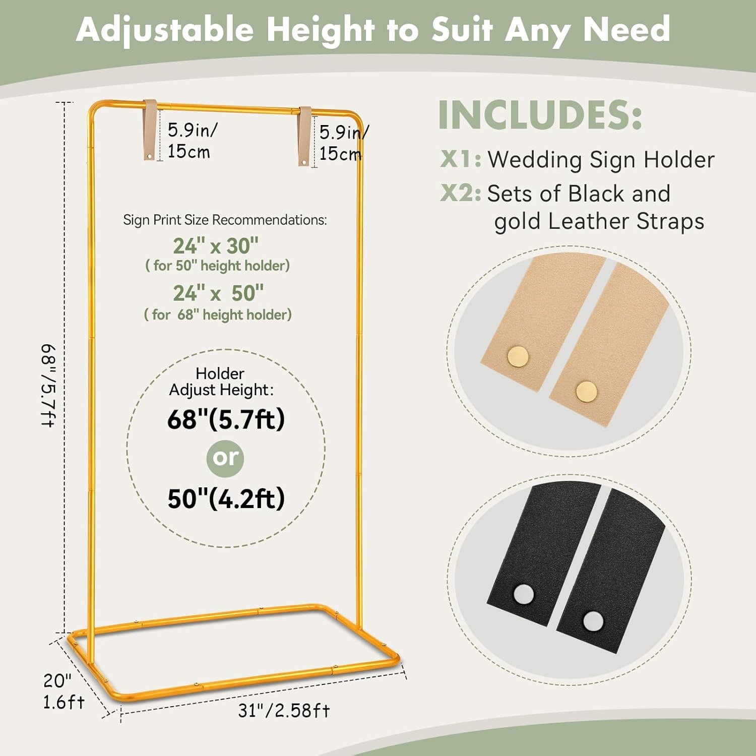 This elegant sign holder is constructed from sturdy, durable thick iron tubing with a shimmering gold finish that perfectly reflects light, adding a touch of refined elegance to your wedding welcome sign, seating chart, or front door welcome sign. Its robust construction ensures long-term use both indoors and outdoors.